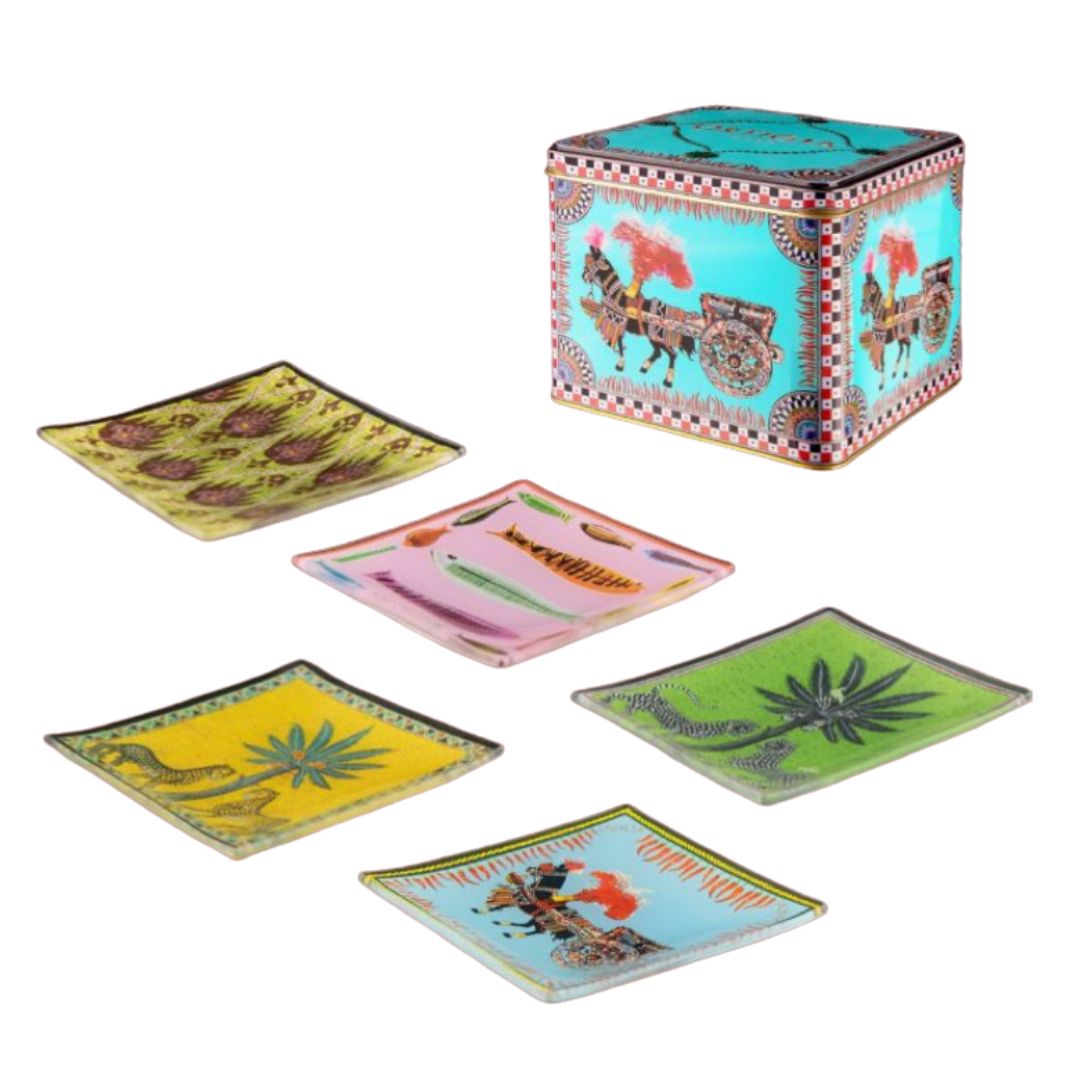 Blik met 5 glazen bordjes: Bergamotto, Carretto, Zagara, Green Gattopardo & Fishy